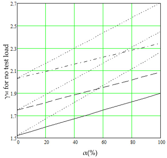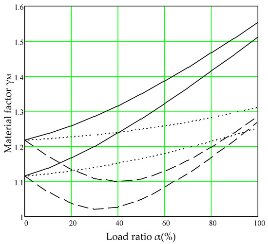 Figure 4 gives the material-safety factors as a function of the load ratio α, calculated via the equations above without considering the uncertainty of two materials (VM = 0.15, 0.2) and for two variable loads (VQ = 0.4 and VQ = 0.2). For α = 0%, only the permanent load is acting, while for α = 100%, only the variable load is acting. The solid lines denote the dependent load combination (and 50-year variable-load setting); dashed lines apply to the independent load combination (and 5-year variable-load setting). The upper lines denote VM = 0.2, and the lower ones VM = 0.15. The dotted lines apply to the dependent load combination with VQ = 0.2, e.g., a live load.