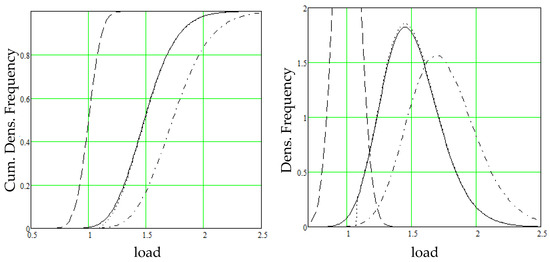 Figure 6 demonstrates the idea in the actual permanent load and resistance distribution of high-quality timber, β50 = 3.2, VM = 0.15, μM = 1.5. The test load is 1.071 obtained from Equation (7). Test loading is not needed if the mean resistance is γM = 1.749 obtained from Equation (4). The dashed lines apply the permanent load distributions; the solid lines are material distributions; the dotted lines are material distributions after test loading; and the dash-dotted line applies to the resistance distribution where test loading is not needed.