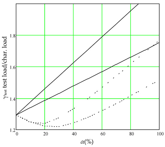 In Figure 8, the test loads γtest are given as the function of the load proportion α, assuming that the reliability is obtained from the loading only; i.e., the resistance of the material is entirely unknown and has no resistance beyond the test load. The solid line applies to the dependent load combination, β50 = 3.2. The dotted curves denote the corresponding independent load combination. The upper lines refer to VQ = 0.4 and the lower ones to VQ = 0.2, respectively.