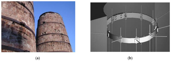 To improve the seismic behavior of slender masonry constructions, such as chimneys or towers, the use of steel reinforcements rings attached to the primary structure by steel rebars is commonly adopted (solution 1) [18]. In other cases, an inner spiral reinforcement is applied, as shown in Figure 1. For these slender constructions, structural improvements are necessary to overcome the dynamic effects caused by wind and/or seismic actions.