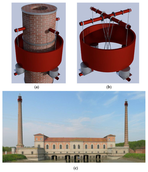 A 3D render of the real, tuned mass damper (TMD) design for a masonry slender structure proposed to the Italian Cultural Heritage. (a) The proposed first configuration with the TMD located near the top of the chimney, (b) steel TMD in detail, and (c) view of the historical hydraulic plant (Italy).