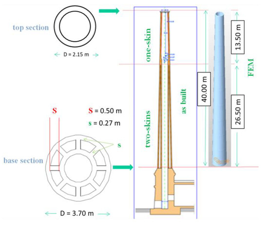 The chimney presents the inner and outer skins from the base to 26.50 m in height. The outer skin is characterized by a tapered section with a diameter ranging between 3.70 m at the base to 2.62 m at the height of 26.50 m. Above the quote of 26.50 m, the chimney has only one skin (the external one) with different thicknesses: 0.51 m from 26.50 m to 28.00 m, 0.37 m from 28.00 m to 28.90 m, 0.33 m from 28.90 m to 29.23 m, and 0.28 m up to the top.