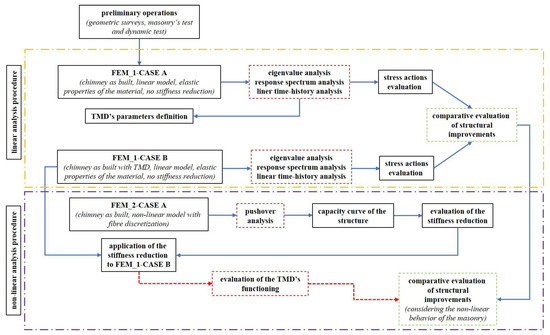The main steps of the optimization procedure of the TMD design are summarized in Figure 6. The proposed procedure is based on two main steps. In the first step, the dynamic behavior of the analyzed structure is obtained through the implementation of a simplified finite element model to calculate the fundamental characteristics of the TMD after an optimization process performed by the execution of linear time-history analyses. Defined the TMD properties, expressed in terms of mass, equivalent stiffness, and equivalent damping; in the second step, the operating limit of the optimized TMD is evaluated considering a fiber model where the nonlinear behavior of the masonry is considered.
