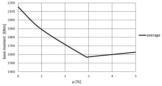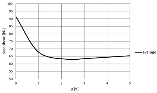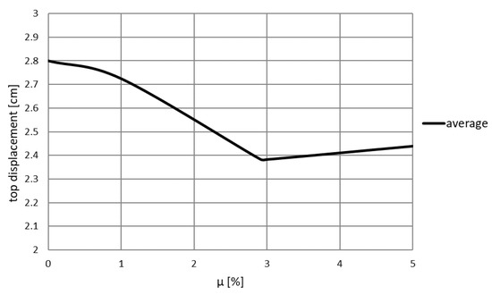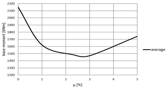 The preferable solution, from a construction point of view, is the one where the TMD is installed at quote 26.50 m, using a connection system with the steel structure (Figure 3b). The main advantage of the 26.50 m height positioning of the TMD is the possibility to avoid reinforcement of the upper part of the chimney, where only one skin is present. Figure 8, Figure 9 and Figure 10 show the optimization curves, expressed in terms of an average value of base shear, bending moment, and top displacement as a function of μ, obtained by integration of the dynamic equation of the structure under the set of seven spectrum-compatible accelerograms [13,33] considering the TMD positioned at 26.50 m, while Figure 11, Figure 12 and Figure 13 show the results of the optimization process for the case of the TMD positioned at 40.00 m.