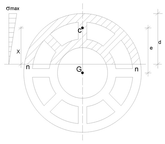 From the FEM_1—CASE A, considering the design’s seismic action [33,34] and evaluated at the base section of the chimney, it obtained an axial force, FZ = 2711.20 kN, a bending moment, MX = 3877.00 kNm, and a shear force, Fy = 151.00 kN. Moreover, the top displacement is equal to 0.060 m is obtained. It is important to highlight that in this case, the maximum compression acting on the chimney base section is equal to 2.35 MPa less than the masonry compressive strength (3.55 MPa). On the contrary, more than half of the base cross-section presents tensile stresses with the neutral axis (n) located at the distance d = 1.60 m from the more compression edge of the section (Figure 14, where G is the gravity center, c is the load application point, n indicates the neutral axis and e is the eccentricity) and consequently several crack patterns can be formed.