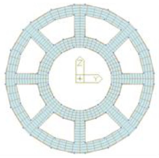 To investigate the TMD functioning over the elastic behavior of the chimney, a fiber model representing the structure without the TMD (FEM_2—CASE A) was implemented to perform pushover analysis [44,45] to obtain the capacity curve of the masonry chimney through the application of a modal load distribution proportional to the first vibration mode. To consider the nonlinear behavior of the masonry, a compression elastic–brittle constitutive law was adopted considering a tensile strength equal to 0. In particular, the chimney’s fiber model is divided into beam elements having a height equal to 5 m, to which the nonlinear properties of the masonry are assigned. Figure 16 reports the fiber discretization of the base section.
