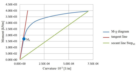 Considering Stepult, the correspondence point on the moment-curvature (M-χ) diagram of each section of the chimney are determined to obtain the scale factor to be applied to the elastic stiffness of the cross-sections of the chimney calculated as the ratio between the stiffness evaluated in correspondence to the considered point of the capacity curve and the elastic stiffness of the analyzed cross-section. Figure 19 reports the M-χ diagram of the base cross-section.