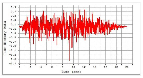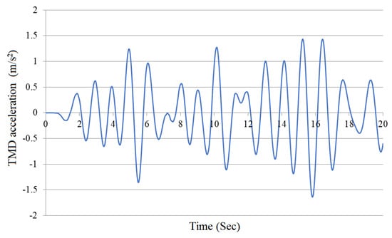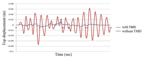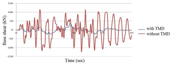 Once the TMD was optimized, and the behavior of the masonry chimney with TMD was investigated considering even the operation of the device over the elastic behavior of the chimney, a standard approach through the execution of nonlinear time-history analysis was executed to confirm the results obtained by the proposed procedure. The seismic action used is represented by Accelerogram 1 of the seven spectrum-compatible accelerograms mentioned in Section 2 (see Figure 20). Figure 21 and Figure 22 show the trend of the top displacement and the base shear of the chimney, with and without TMD, when the structure remains within the elastic range. However, the showed results are valid to the Stepfun. The optimized TMD benefits are confirmed by significant reductions in the response obtained both in terms of top displacement and base shear. Consequently, the use of the TMD is an effective solution to reduce the effects of the seismic action. This reveals the TMD capabilities to protect slender historical masonry structures (as the chimney), not only for concrete and/or steel structures. Furthermore, the procedure proposed represents an alternative to the nonlinear time-history analyses, commonly used by the designers to optimize the TMD parameters.