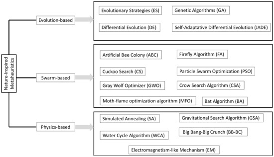 Essentially, a clear classification of metaheuristic methods does not exist. Despite this, several categories have been proposed that considered different criteria, such as a source of inspiration, type of operators or cooperation among the agents. In relation to inspiration, nature-inspired metaheuristic algorithms are classified into three categories: Evolution-based, swarm-based, and physics-based. Evolution-based approaches correspond to the most consolidate search strategies that use evolution elements as operators to produce search patterns. Consequently, operations, such as reproduction, mutation, recombination, and selection are used to generate search patterns during their operations. The most representative examples of evolution-based techniques, include Evolutionary Strategies (ES) [2,3,4], Genetic Algorithms (GA) [5], Differential Evolution (DE) [6] and Self-Adaptative Differential Evolution (JADE) [7]. Swarm-inspired techniques use behavioral schemes extracted from the collaborative interaction of different animals or species of insects to produce a search strategy. Recently, a high number of swarm-based approaches have been published in the literature. Among the most popular swarm-inspired approaches, include the Crow Search Algorithm (CSA) [8], Artificial Bee Colony (ABC) [9], Particle Swarm Optimization (PSO) algorithm [10,11,12], Firefly Algorithm (FA) [13,14], Cuckoo Search (CS) [15], Bat Algorithm (BA) [16], Gray Wolf Optimizer (GWO) [17], Moth-flame optimization algorithm (MFO) [18] to name a few. Metaheuristic algorithms that consider the physics-based scheme use simplified physical models to produce search patterns for their agents. Some examples of the most representative physics-based techniques involve the States of Matter Search (SMS) [19,20], the Simulated Annealing (SA) algorithm [21,22,23], the Gravitational Search Algorithm (GSA) [24], the Water Cycle Algorithm (WCA) [25], the Big Bang-Big Crunch (BB-BC) [26] and Electromagnetism-like Mechanism (EM) [27]. Figure 1 visually exhibits the taxonomy of the metaheuristic classification. Although all these approaches consider very different phenomena as metaphors, the search patterns used to explore the search space are exclusively based on spiral elements or attraction models [10,11,12,13,14,15,16,17,28]. Under such conditions, the design of many metaheuristic methods refers to configuring a recycled search pattern that has been demonstrated to be successful in previous approaches for generating new optimization schemes through a marginal modification.