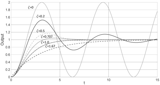 If , a special case is presented in which the temporal system response is oscillatory. The output of these behaviors is visualized in Figure 2 for the cases of , , and . Under the underdamped behavior, the system response starts with high acceleration. Therefore, the response produces an overshoot that surpasses the value of one. The size of the overshoot inversely depends on the value of .