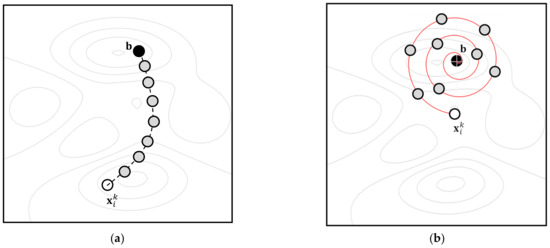 Two of the most popular search models are attraction and spiral trajectories. The attraction model generates attraction movements from to . The attraction model is used extensively by several metaheuristic methods such as PSO [10,11,12], FA [13,14], CS [15], BA [16], GSA [24], EM [27] and DE [6]. On the other hand, the spiral model produces a spiral trajectory that encircles the best element . The spiral model is employed by the recently published WOA and GWO schemes. Trajectories produced by the attraction, and spiral models are visualized in Figure 3a,b, respectively.