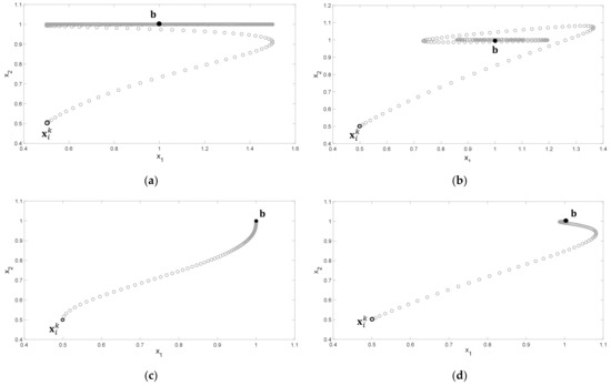 where () corresponds to the search agent while () symbolizes the decision variable or dimension. Since the behavior of each search pattern depends on the value of , it is easy to combine elements to produce interesting trajectories. Figure 4 presents some examples of trajectories produced by using different values for . In the Figure, it is assumed a two-dimensional case () where the initial position of the search agent is and the final location or the best location . Figure 4a presents the case of and . Figure 4b presents the case of and . Figure 4c presents the case of and . Finally, Figure 4d presents the case of and . From the figures, it is clear that the second-order responses allow producing several complex trajectories, which include most of the other search patterns known in the literature. In all cases (a)–(d), the value of has been set to 1.