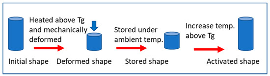 The most common shape memory materials are shape memory alloys (SMAs) and shape memory polymers (SMPs). SMPs are distinguished from SMAs by unique properties, such as their light weight, ease of processing, low cost, and high shape recovery abilities. The shape memory effect can be observed in heat-activated SMPs when thermo-mechanical cycles are performed. These thermo-mechanical cycles consist of three main steps. First, the SMP is processed into a permanent shape, then it is heated up beyond glass transition temperature (Tg) and deformed. Next, it is cooled to reach its temporary shape. After that, it is heated to glass transition temperature (Tg) to trigger the shape recovery process, which returns it to its original permanent shape. The thermo-mechanical cycles are shown in Figure 1.