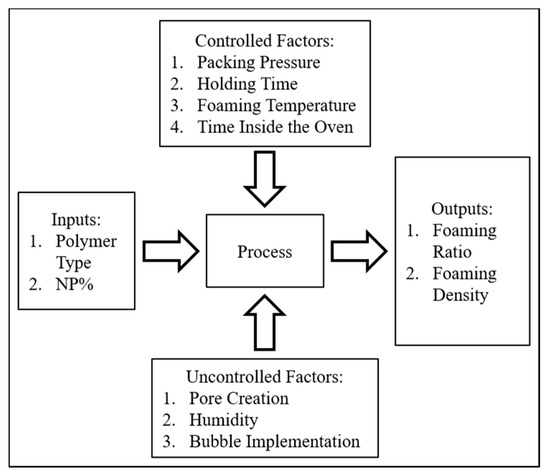 The input materials used in this research were the polymer type and the amount of NPs. The control factors that could be manipulated were packing pressure, holding time, foaming temperature, and foaming time. The uncontrolled factors that could not be changed were pore creation, humidity, and bubble implementation. The output from the process was the foaming ratio and density as measured. A model can be seen in Figure 2 below.