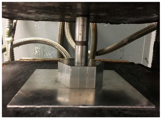 The tablets used in this research were prepared according to different parameters, based on the Taguchi plan generated. All of the tablets had a total weight of 5 g of polymer powder or, in some cases, polymer powder plus Fe3O4 NPs. The powder was poured into a stainless steel mold with an inner diameter of 20.3 mm, and the mixture was then packed gently into the mold using a stainless steel plunger. This weight was selected in order to avoid any powder loss when packing with the plunger. The whole setup was then placed on a stainless steel base. A Carver Hydraulic Press System® provided the required pressure at a pump rate of 1.56 mm/s, as shown in Figure 3. Applying high pressure to the powder causes it to stick together and form a tablet with the desired dimensions of 9 mm in height and 20.3 mm in diameter. Finally, the tablet was extracted from the mold via a gentle hammering process to avoid cracking or breaking it.