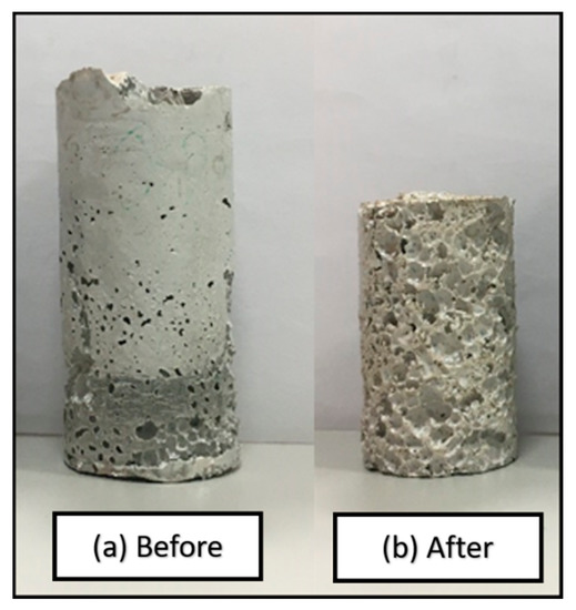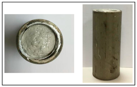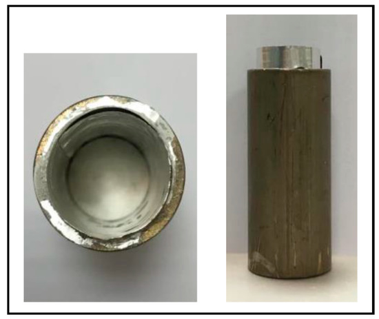 After the tablet is extracted, it is ready for the second processing stage, namely, the foaming stage. The foaming temperature and time have to be determined. Thus, a pre-test was carried out to choose the best foaming temperatures. All of the tablets were placed on a thick aluminum sheet and then slowly inserted inside another mold (see Figure 4) with an inner diameter of 20.7 mm. They were then placed in an oven with a predetermined temperature in order to start the foaming process. These tablets were placed in the oven for specified times and were allowed to cool in air for 15 min. The resultant sample shape was cylindrical (see Figure 5). This foaming technique is called solid-state foaming and it was recently proposed and tested for the first time on polymers using 3M Epoxy Resin by Quadrini and Squeo [12]. After foaming, the samples were extracted from the mold and transferred for further testing.