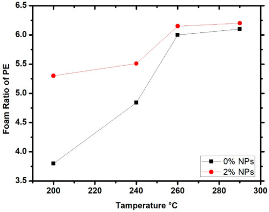 The process parameters were expected to have the same effect on the foaming ratio and density, as increasing foaming ratios lead to a decrease in density. This is valid unless NPs are added. If the polymer contains NPs, the foaming ratio is improved, but the density does not necessarily decrease just because the NP density increases the composite density.