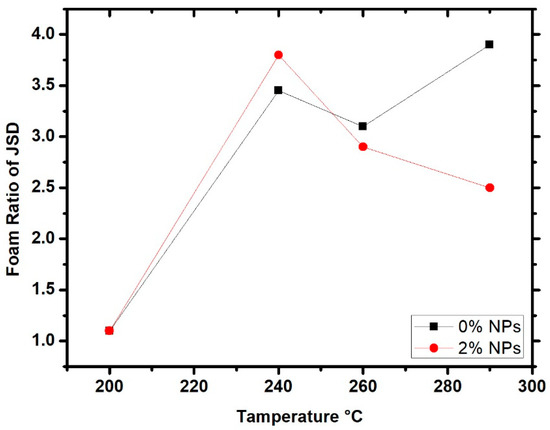 On the contrary, the JSD showed lower ratios of 2.75 as compared to 3.54 at 0% of NPs. This result is not consistent with the expected outcome, as the addition of NPs is supposed to improve formality. A careful investigation of this phenomenon suggested that the foaming temperature working range was dependent on polymer type. Hence, a new experiment was conducted to verify this. A foaming temperature of 240 °C was used and the foaming ratio was 3.8, which indicated an improvement of 7% as compared to the 0% of NPs. It can, therefore, be concluded that the effect of foaming temperature is dependent on polymer type. Due to this dependency, the parameters suggested by the Taguchi analysis were not optimal. Therefore, a further tuning of the Taguchi parameters was carried out and the following sections discuss the results obtained from the optimal factors suggested by the Taguchi analysis and the modified factors based on our experimental observations.