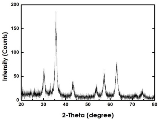 In order to explore the structural properties, XRD runs were performed using copper (Cu) Kα radiation with a wavelength of λ = 1.540 Å. This was conducted at a scanning rate of 2° per minute within a range from 20° to 80°. Figure 11 shows the XRD pattern for the prepared Fe3O4. This pattern matches perfectly the standard patterns shown in Figure 12. The crystal size of the nanoparticles was obtained by using OriginPro8 software and the Sherrer Equation (see below):