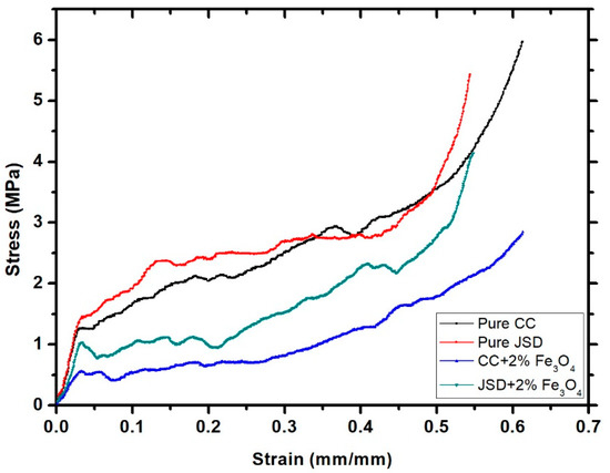 Mechanical compression tests were operated on pure polyester, pure JSD, polyester composite, and JSD composite. The results are shown in Figure 13 below; the addition of Fe3O4 into both polymers’ matrices caused a reduction in the yield strength of both composites, a strong reason for which might be the thermoset property of the polymers used.