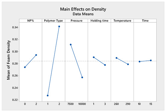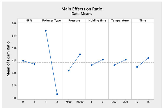 Moreover, as more packing pressure was applied while making the tablets, a higher foaming ratio was obtained with a lower foam density. This trend is also noticeable regarding holding time, foaming temperature, and foaming time (see Figure 14 and Figure 15). All of the parameters exhibited higher foaming ratios and lower foaming densities at their higher levels.