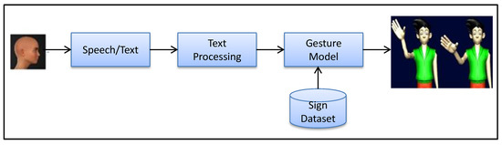 In India, more than 1.5 million people are hearing-impaired who use ISL as their primary means of communication [8]. Some studies [6,8,9] implemented ISL videos for sign representation from English text. To generate a robust sign language learning system from English to ISL, output sign representation should be efficient, such as being able to generate proper signs without delay for complete sentences. However, sign language translation from ISL video recordings requires notable processing time [6]. By contrast, the sign representations using a 3D avatar require minimum computational time, and the avatar can be easily reproduced as per the translation system [10]. Moreover, most of the existing studies [11,12] have not considered complete sentences for sign language conversion. To overcome these shortcomings, in this paper, we propose a 3D avatar-based ISL learning model that can perform sign movements not only for isolated words but also for complete sentences through input text or speech. The flow diagram of such an assisting system is depicted in Figure 1, where the input to the system is either English speech or text, which is then processed using a text processing technique to obtain ISL representation. Next, a gesture model is used to perform the sign movement corresponding to ISL with the help of an avatar. The main contributions of the work are defined as follows.