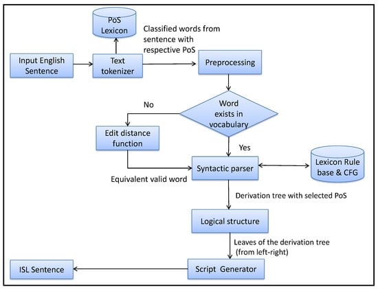 This section provides the details of the conversion process from English text to its corresponding ISL text. The words in the ISL sentence have been identified to generate corresponding sign movements. For the conversion from English to ISL, we use the Natural Language Toolkit (NLTK) [34]. The model of converting the ISL sentence from an English sentence is plotted in Figure 3. A detailed discussion of the translation process is presented below.