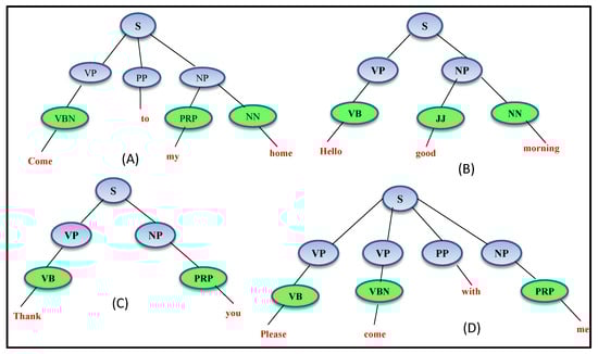 After the preprocessing step, the NLTK module returns the parse tree based on the grammatical tokens (VP, PP, NP, etc.). Then, we construct the derivation tree of the Context-Free Grammar (CFG), which is similar to the parse tree of the NLTK module. CFG consists of variable/nonterminal symbols, terminal symbols, and a set of production rules. The nonterminal symbols generally appear on the left-hand side of the production rules, though they can also be introduced on the right-hand side. The terminal symbols appear on the right-hand side of the rules. The production rule generates the terminal string from the nonterminal symbol. The derivation tree can represent the derivation of the terminal string from the nonterminal symbol. In the derivation tree, terminal and nonterminal symbols refer to the leaves and intermediate nodes of the tree. Each meaningful ISL sentence has its own derivation tree. After the creation of the derivation tree, the leaves of the tree are combined to make a logical structure for the sign language. We have plotted the different derivation trees for a few sentences in Figure 4A–D.