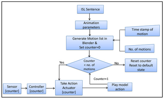 The generation of sign movements based on the input text is accomplished with the help of an animation tool called Blender [37]. The tool is popularly used for designing games, 3D animation, etc. The game logic and game object are the key components of the Blender game engine. We developed the 3D avatar by determining its geometric shape. The whole process for creating the avatar is divided into three steps. First, the skeleton and face of the avatar are created. In the second step, we define the viewpoint or orientation of the model. In the third step, we define the movement joints and facial expressions of the avatar. Next, we provide the sequence of frames that determine the movement of the avatar over the given sequence of words over time. Finally, motion (movement like walking, showing figures, moving hands, etc.) is defined by giving solid animation. The game engine was written from scratch in C++ as a mostly independent part and includes support for features such as Python scripting and OpenAI 3D sound. In this third module, we generate sign movements for the ISL sentence (generated in the second module). The entire framework of the movement generation of the avatar from the ISL sentence is described in Figure 5. For the generation of sign movement from ISL, initially, the animation parameters are extracted from the ISL sentence. Once the animation parameters are identified, the motion-list of each sign is performed using a 3D avatar model. In the proposed 3D avatar model, each movement is associated with several motions, and all such motions are listed in the “motionlist” file. A counter variable is initialized for tracking current motion. Each motion has its timestamps mentioning how long the action of different gestures will be performed. Each motion is generated by a specific motion actuator when some sensor event has occurred. The controller acts as a linker between the sensor and actuator. The conditional loop checks the maximum bounds of the number of motions, and it performs the motion one by one using a specific actuator (e.g., the actuator[counter]). The next valid motion is performed by incrementing the counter variable. If the value of the counter variable exceeds the number of motions in the “motionlist” file, then the counter variable along with the “motionlist” is reset to the default value, and the next movement will be performed.