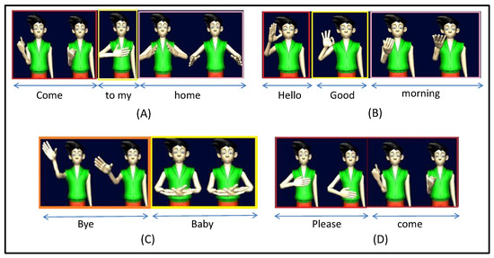 Sign language representations of English sentences: (A) Come to my home, (B) Hello, good morning, (C) Bye baby, (D) Please come.