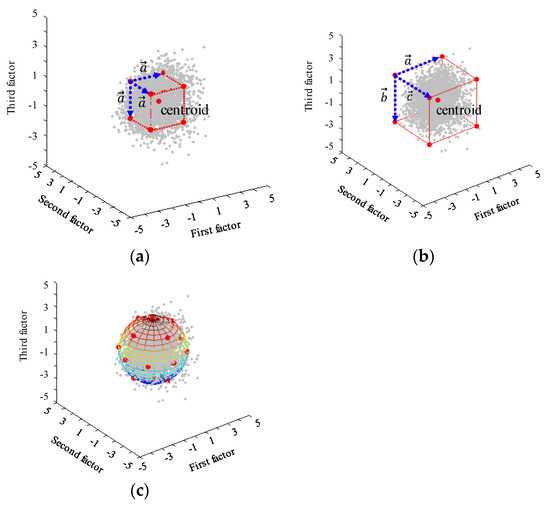 To overcome the multivariate accommodation limitation of the percentile method, multivariate RH generation methods such as the rectangular, square, and circular methods (operationally termed in the present study) were developed using variable reduction techniques such as factor analysis (FA) and principal component analysis (PCA). The square method (SM; Figure 1a) generates RHs at the centroid and corners of a square boundary formed in the space of factors extracted by FA [8,9]. Next, the rectangular method (RM; Figure 1b) follows the same technique used in the SM, except it uses a rectangular boundary formed to statistically enclose a designated percentage of the population, as proposed by Kim and Whang [10]. Lastly, the circular method (CM; Figure 1c) employs PCA for variable reduction [11,12] and generates RHs at the centroid and points with a predefined angular interval (e.g., 45°) on the circular boundary formed in the space of components [13,14,15].