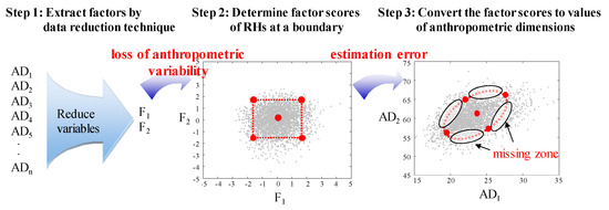 Limitations of the existing multivariate generation methods include loss of anthropometric variability, the estimation error of ADs, and lack of body size diversity, as illustrated in Figure 2. Data reduction techniques such as FA and PCA reduce an original set of ADs to a small set of factors or components, while the majority of the body size variability (e.g., 60–97%) of the target population is accounted for, as shown in Table 1. Although this information distillation greatly simplifies the generation process of RHs, a significant proportion (e.g., 3–40%) of the body size variability not explained by extracted factors is lost in the RH generation process. Next, the conversion process of the factor scores of RHs to values of ADs causes significant estimation errors if the extracted factors (or components) are not strongly correlated with the ADs. Lastly, missing zones exist between the RHs along a boundary, which again causes a loss of the size diversity of the target population during the RH generation process.