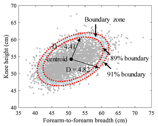 To identify anthropometric cases representing a designated κ of the target population, a BZ is constructed using the distribution of normalized squared distances of anthropometric cases from the centroid of the target population. A normality test, such as the Kolmogorov–Smirnov test, is applied to examine if the data set of an AD can be modeled by a normal distribution. For non-normal ADs, the Box–Cox transformation technique [22] is applied for normalization. Then, each anthropometric case of the target population is converted into a normalized squared distance (D) by Equation (1), which follows a χ2-distribution with degrees of freedom (df) = n (the number of ADs under consideration), as ADs are multivariate normal [23,24,25]. Thus, the boundary of a designated κ of the target population is determined by (1 − κ) and the BZ for the designated κ can be constructed using two boundaries for κ ± tolerance (δ) (e.g., 90% ± 1%). Figure 3 illustrates a BZ formed by two boundaries using (1 − 0.89) = 4.41 and (1 − 0.91) = 4.81, where two ADs (n = 2) follow a bivariate normal distribution and κ ± δ = 90 ± 1% [4].