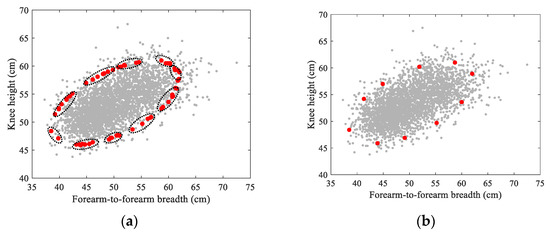 Clustering and selection of anthropometric cases within a boundary zone (illustrated). The number of anthropometric dimensions (n) = 2; accommodation percentage (κ) = 90%; tolerance (δ) = 1%. (a) Clusters formed by K-means cluster analysis; (b) representative cases selected in clusters.