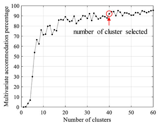 To form an optimal group of RHs, K-means cluster analysis is applied to the anthropometric cases within the BZ. Anthropometric cases with similar body sizes are grouped into the same cluster, as illustrated in Figure 4a. An appropriate number of clusters can be determined by in-depth analysis on the MAP. For example, Figure 5 illustrates that the optimal number of clusters for the number of ADs = 10, κ ± δ = 90% ± 1%, and the number of anthropometric cases with the BZ = 60 can be determined at 40, from which the MAP stably satisfies the designated κ.