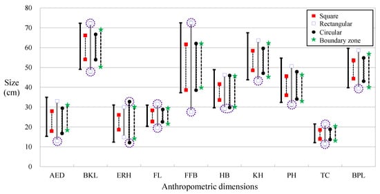 Occurrence of improper representative humanoids (highlighted in dotted circles) beyond the body size ranges of the target population. AED, abdominal extension depth; BKL, buttock–knee length; ERH, elbow-rest height; FL, foot length; FFB, forearm-to-forearm breadth; HB, hip breadth; KH, knee height; PH, popliteal height; TC, thigh clearance; BPL, buttock–popliteal length.