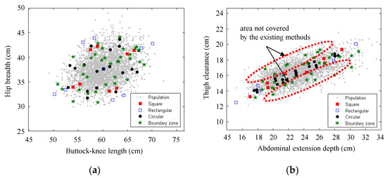 Distribution of the representative humanoids generated by the multivariate methods (illustrated). (a) Buttock–knee length vs. hip breadth, with a different factor loading pattern; (b) abdominal extension depth vs. thigh clearance, with a similar factor loading pattern.