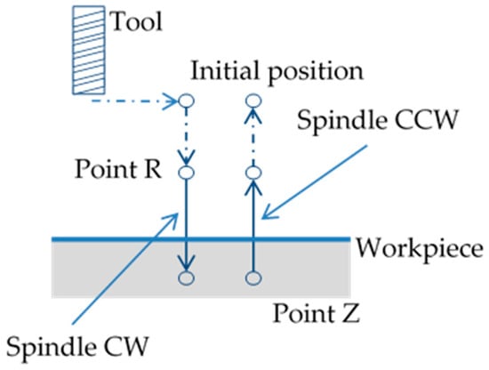 Figure 2 shows that the experiments were performed in an NDV series machine tool (Yeong-Chin machinery industries Co. Ltd., Taichung, Taiwan) with a FANUC 31iMA controller. The material used for the through-hole processing experiments was polymethyl methacrylate (PMMA) due to its high plasticity, high hardness, and low brittleness. The PMMA was considered an excellent experimental material because it enabled observation of broken or irregular cutters’ effects. Therefore, even a significant synchronization error would be unlikely to damage the tapping tool in the tapping axis. The phenomena of stripped thread or thread damage can still be observed in PMMA. An M6 × 1 tapping tool was used in the experiments. The cutting conditions were as follows. Spindle speed, tapping axis feed rate, and tapping depth were set to 3000 RPM, 3000 mm/min, and 50 mm, respectively. The experiment was performed five times at these settings. Figure 3 shows the processing path.