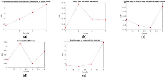 Response table from Table 13. (a) Proportional gain of velocity loop for spindle in servo mode; (b) Delay time for motor excitation; (c) Integral gain of velocity loop for spindle in servo mode; (d) Advanced feedforward; (e) Position gain of servo axis for rigid tap.