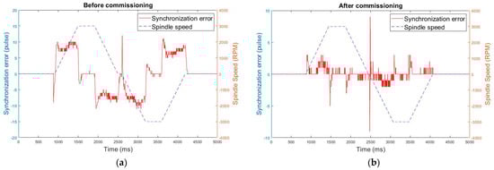 Synchronization error waveforms in rigid tapping before (a) and after commissioning (b).