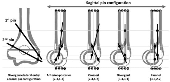 In contrast to the coronal plane, the construct stiffness of each pin configuration in the sagittal plane has not been extensively evaluated, with few biomechanical or clinical studies on the issue. Anterior to posterior (AP) pinning is currently the most common recommendation for sagittal pin configuration. Ariño suggested using two Kirschner wires (K-wire) with either parallel or crossed pin configuration in both the coronal and sagittal plains [24]. Kallio and Skaggs suggested the appropriate inclination for sagittal pin insertion is from the anterior part of the distal fragment to the posterior part of the diaphyseal cortex [25,26]. Recently, Wallace designed a biomechanical torsion test for sagittal pin configurations [27]. However, no statistically significant difference in torsional stiffness among the three types of sagittal pin configurations was found in the study.