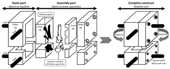 In external and internal torsion tests, we created an epoxy resin mold jig system consisting of outer and inner parts (Figure 2). The outer mold jig was attached permanently to the testing machine at the center of rotation of the long anatomical axis of the humerus to ensure that the position did not vary between specimens. The inner part could be moved into and out of the outer mold jig. After the bone specimen was inserted into the proximal and distal parts of the inner mold jig, it was mounted vertically on an outer jig and secured tightly with multiple bolts and nuts. Loads were applied to the proximal part of the bone by an actuator. The actuator allowed 0–25° of internal and external rotation, and samples were tested at a rate of 0.5 degrees/second. Torque (Nm/degrees) and degrees of rotation were recorded. Based on previous studies, rotational testing beyond 25–30° resulted in a plastic deformation or failure of the construct [16,18]. Thus, in this study, we limited the degree for rotational testing at 25 degrees.