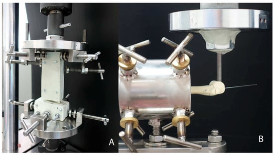 A specimen mounted in the testing machine: (A) axial torsion test (internal and external rotation) using the custom epoxy resin fixation jig and (B) load displacement test (extension, valgus and varus) using the fixed metal tube.