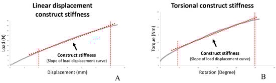 Construct stiffness (Figure 4) was calculated from the slope of the load–displacement curve that best fit the data with the linear portion between 2 and 7 mm of the load–displacement curve and torsional stiffness was measured between 5 and 25 degrees of the load–displacement curve.