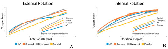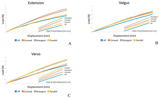 Figure 5 and Figure 6 show a torsional and linear load–displacement curve and slope load–displacement curve (construct stiffness) of all 4 pins configurations under external rotation, internal rotation, extension, valgus, and varus load.