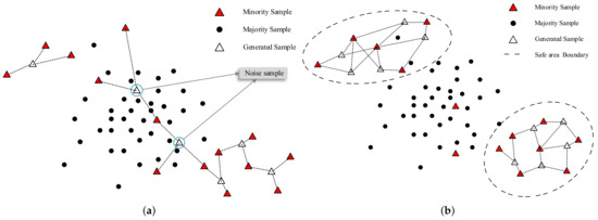 where w is the random weight in [0, 1]. However, SMOTE randomly selects a minority sample to oversample, which may generate minority class samples in majority regions in the presence of noise, as shown in Figure 2a.
