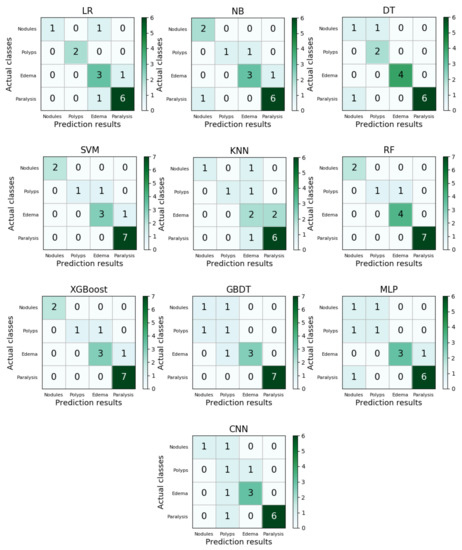 Table 6 shows the results of ten machine learning models before using FC-SMOTE to balance the dataset. The predictive ability of all models is inferior. Due to the class-imbalanced distribution of the sample in the MEEI database, most of the model evaluation measures are lower than 0.5, which may also be due to the current lack of work on the multi-classification of pathological voices. The model evaluation measures of each classifier after imbalanced handing using the FC-SMOTE algorithm are shown in Table 7. Additionally, the results of external validation are shown by a multi-class confusion matrix in Figure 5.