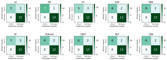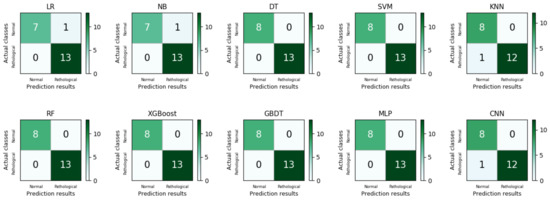 Figure 6 shows the confusion matrix of each machine learning model for detecting normal and pathological voices in the initial class-imbalanced dataset. As can be observed, the classifier’s recognition ability is obviously biased towards the majority class samples (pathological type), while the recognition ability of the minority class samples (normal type) is lacking. Therefore, the model has misleading results for the overall accuracy (). Meanwhile, the binary classification results of the class-balanced dataset are shown in Table 8. Similarly, in the binary classification our experiment focuses on the confusion matrix of the external dataset, as shown in Figure 7.