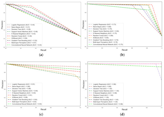(a) Precision-recall curves for multi-class without FC-SMOTE. (b) Precision—recall curves for multi-class with FC-SMOTE. (c) Precision–recall curves for binary classification without FC-SMOTE. (d) Precision–recall curves for binary classification with FC-SMOTE.