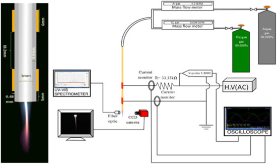 The non-thermal APPJ system consisted of an alumina ceramic (Al2O3) insulator tube with 150 mm length and having a 3 and 4.8 mm inner and outer diameter, respectively (Figure 1). The alumina tube has a purity of 99.7%. The tube was surrounded by two identical copper rings with a 6 mm width and 0.48 mm thickness. The two rings were separated by 10.2 mm. The lower ring was far from the tube nozzle by 5 mm and connected to the ground. A sinusoidal AC high-voltage signal was applied to the upper cupper ring, which was acting as the high-voltage electrode. Argon and oxygen gases with purity 99.999% were blown through the alumina tube to form a plasma jet when the AC high voltage was applied between its electrodes. The gas flow was controlled and measured using mass flow meters (AlicatScientfic MC-5 SLPM (standard liter per minute)-D and MC-20 SLPM-D).
